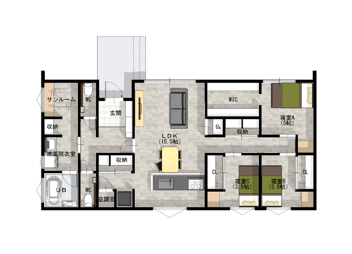 | 間取りの特徴 | 3LDK 平屋 / 水回り / サンルーム ウォークインクローゼット / 全館冷暖空調 |
